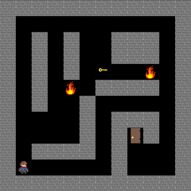 There is an agent who must exit through the door after collecting the key while avoiding the fire.