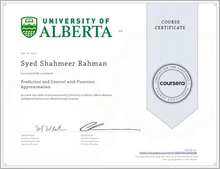 Hey! I'm Syed Shahmeer Rahman, a 4th-year computer science student at the University of Alberta. I'm interested in artificial intelligence and enjoy designing systems that solve real-world problems.